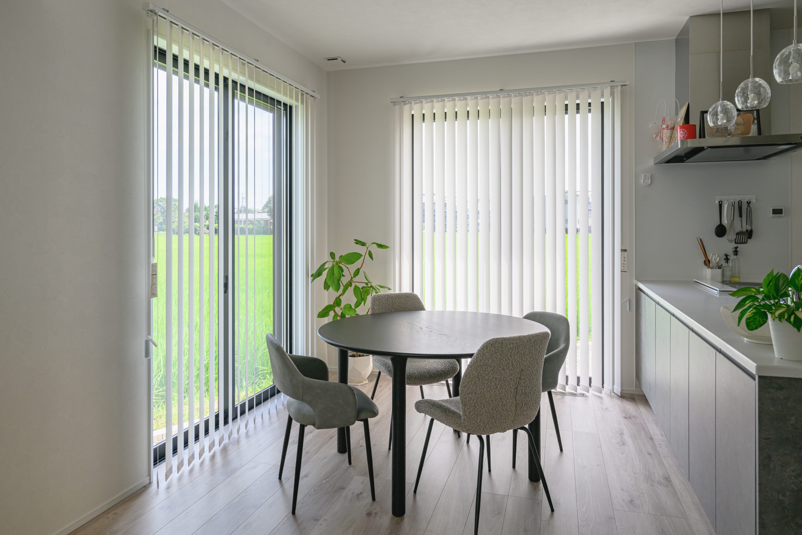 白とグレーを基調にしたLDKは、柔らかな光に包まれる開放的な空間。