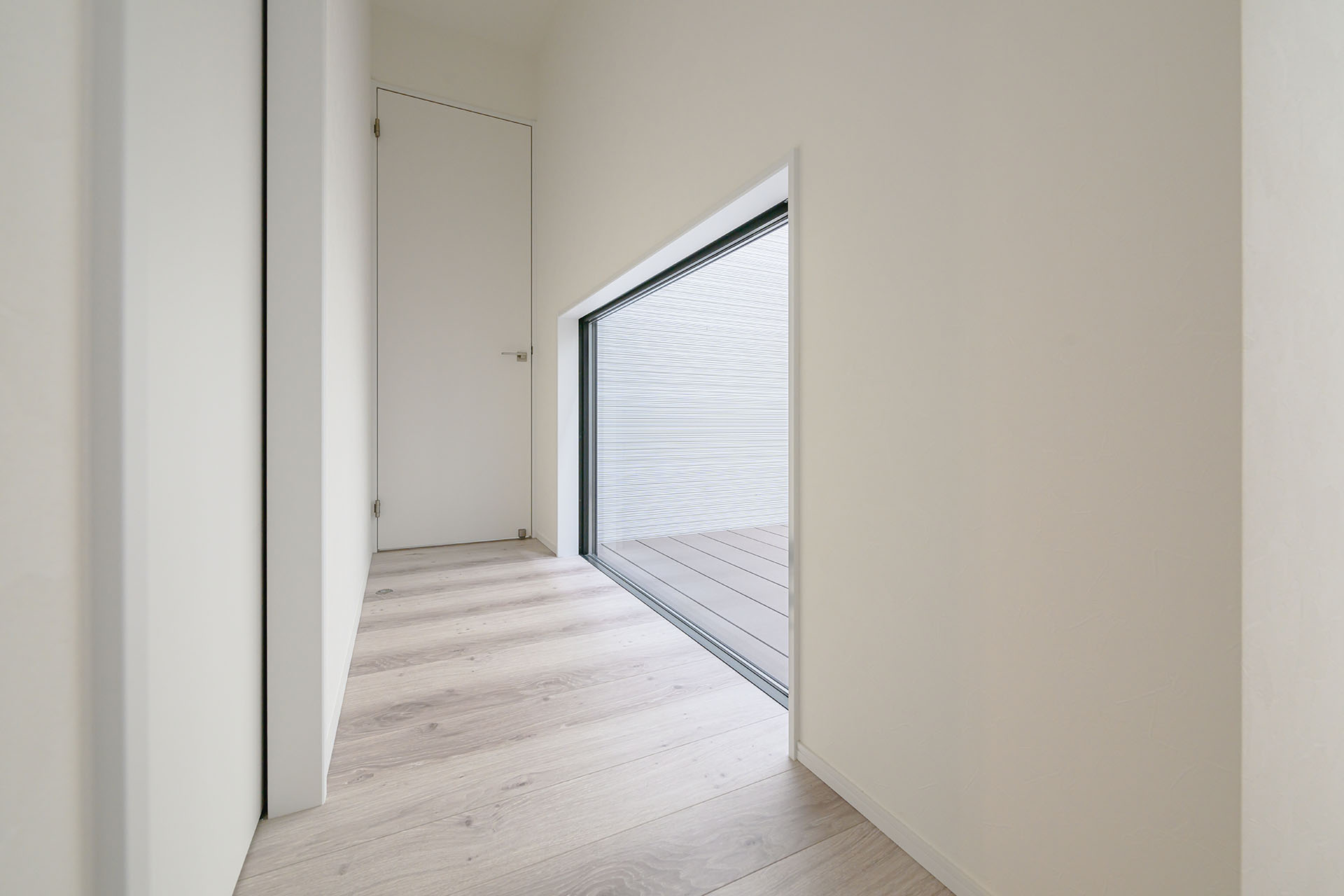 ホワイトを基調にした廊下は、すっきりとした印象の中にやさしい光が差し込みます。大きな掃き出し窓の向こうには中庭が広がり、家の中にいても外の気配を感じられる設計に。