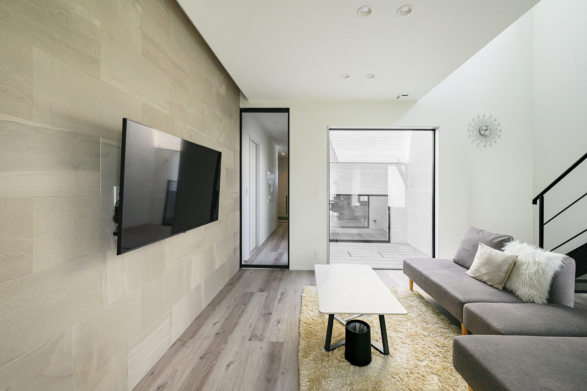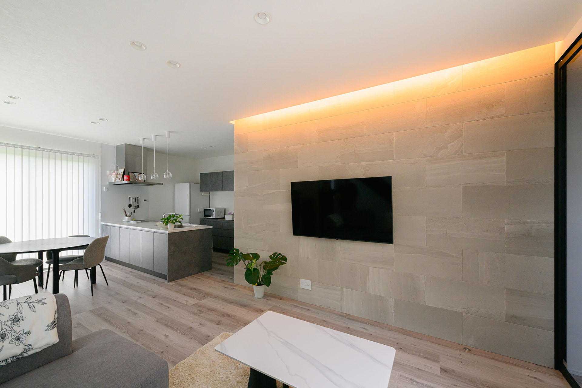 白とグレージュを基調にしたリビングは、洗練された雰囲気と心地よい明るさに包まれた空間。テレビ背面のタイルが上質なアクセントとなり、シンプルながらもホテルのような落ち着きを感じさせます。