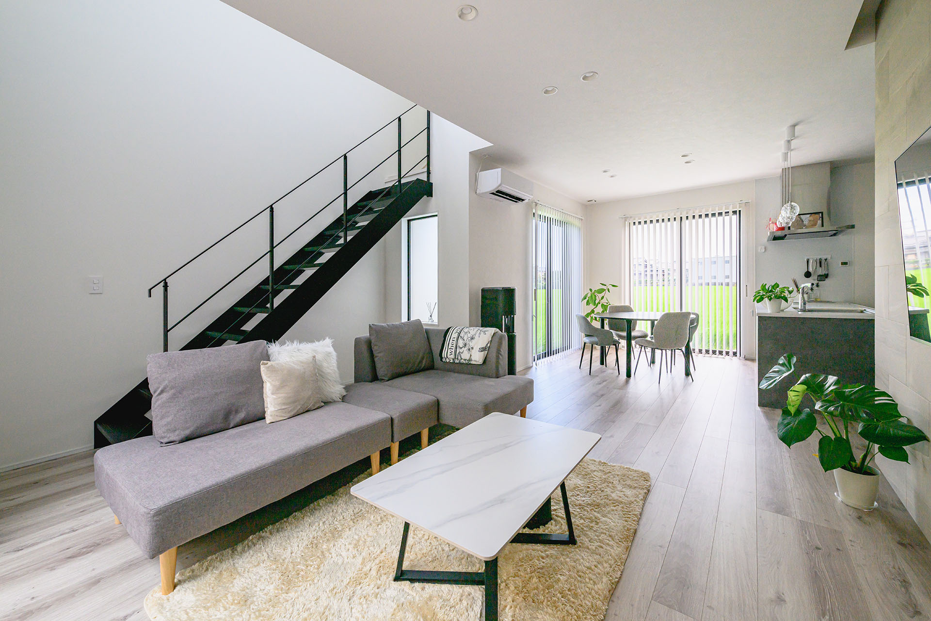 黒のアイアン階段が空間を引き締め、ナチュラルな木目の床やグレーのソファが穏やかな雰囲気をつくり出しています。吹き抜けの効果で光と風が家全体にめぐり、時間帯によって変化する陰影がインテリアをより印象的に見せます。