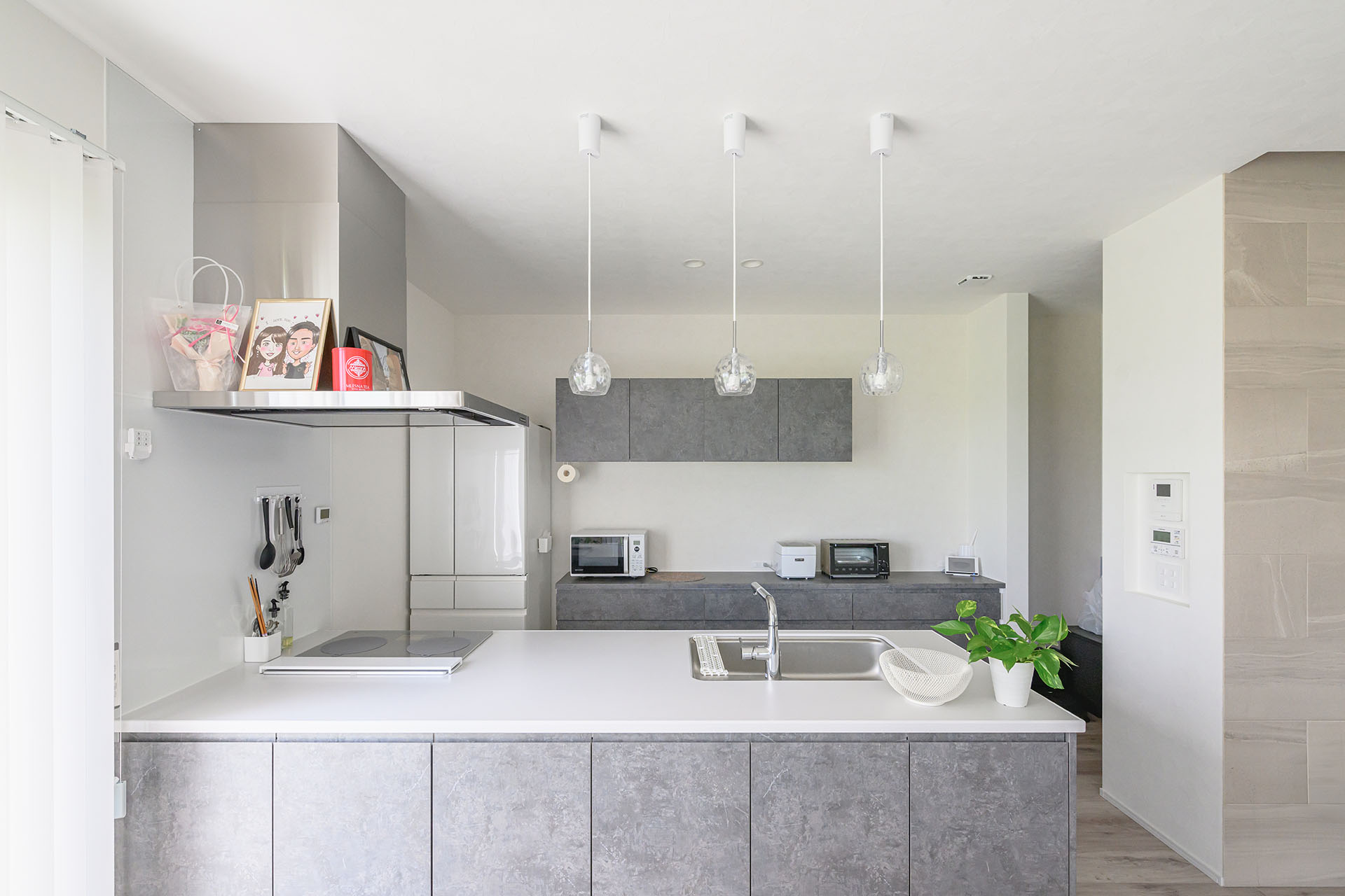 グレーの扉と白いカウンターが印象的なキッチンは、空間全体とトーンを合わせた統一感のあるデザイン。