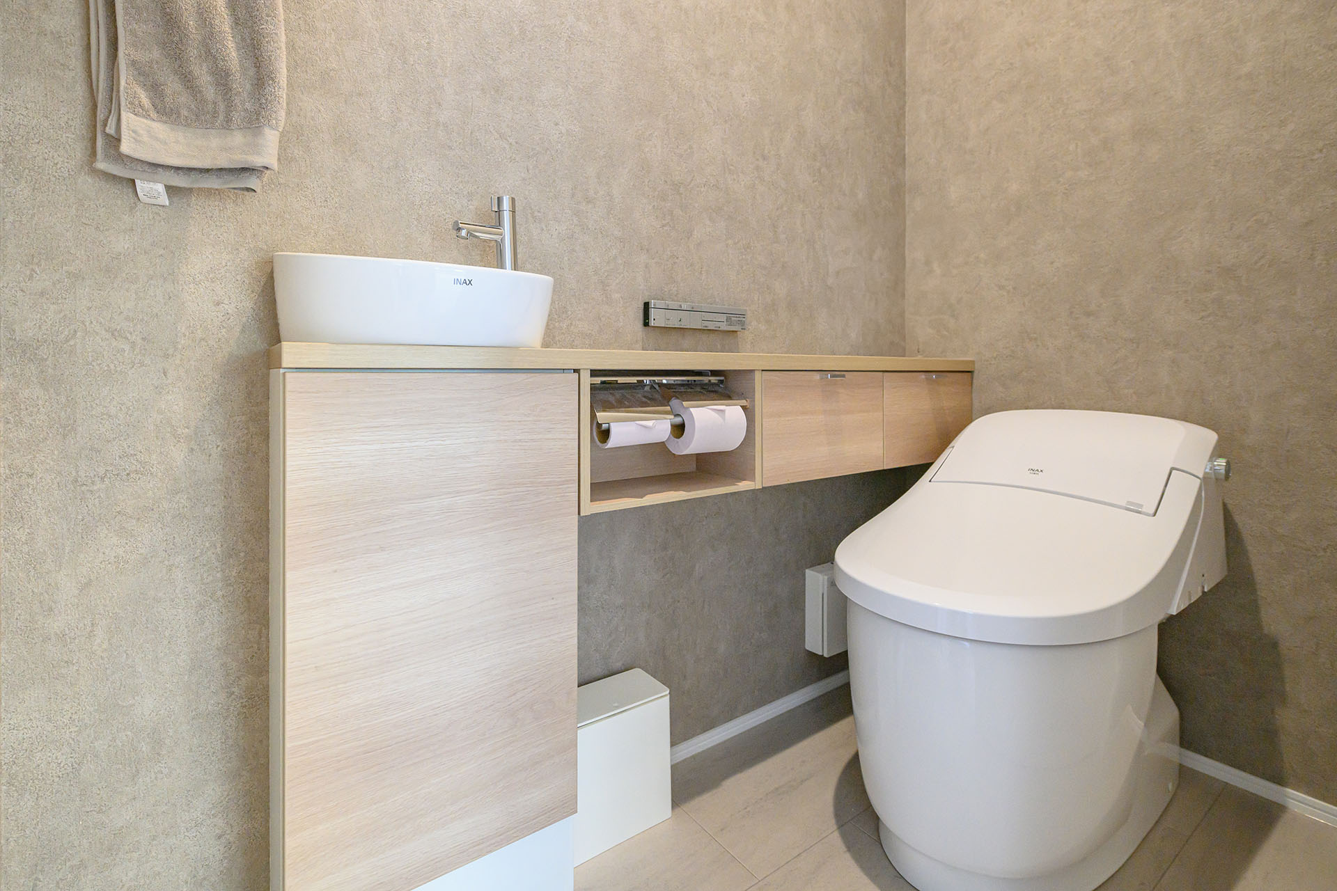 グレーベージュのクロスが印象的なトイレは、質感のある仕上がりで上品な雰囲気に。やわらかい光を受けて壁の表情が変わり、シンプルな空間ながら奥行きを感じさせます。