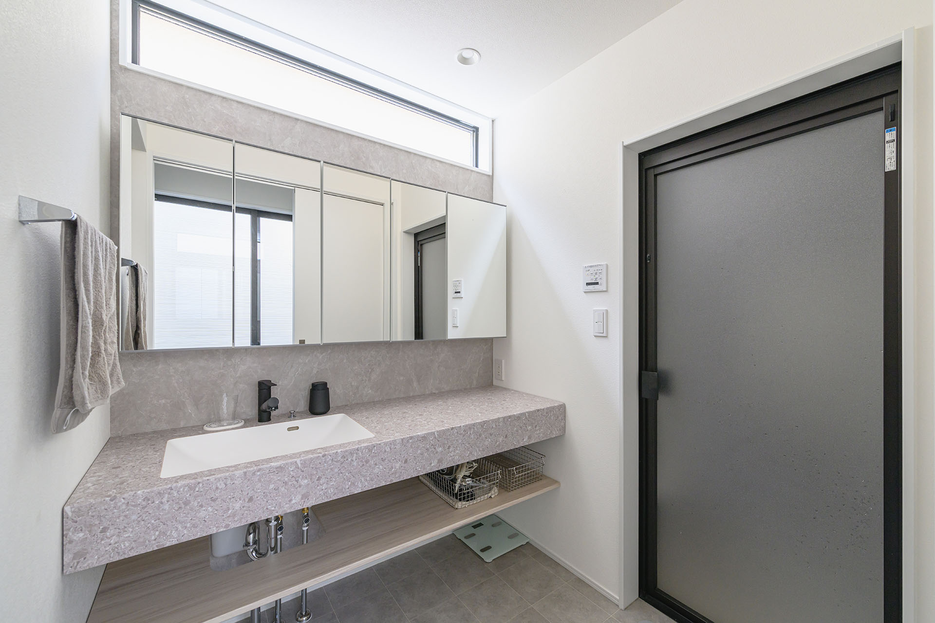 グレートーンのカウンターと壁面で統一した洗面スペースは、落ち着いた雰囲気の中にホテルライクな上質さが漂います。天井近くの高窓からは柔らかな光が入り、朝の支度の時間も心地よくスタートできます。