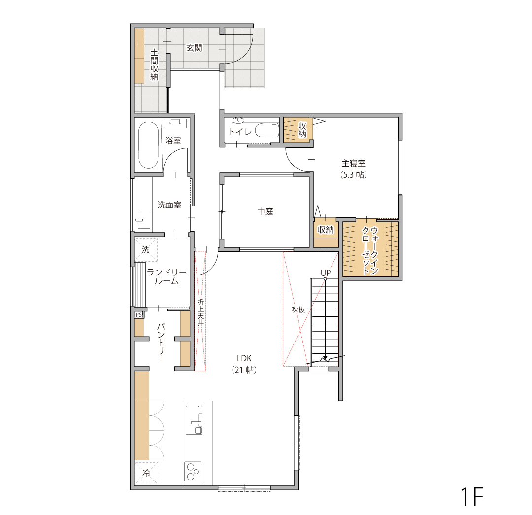 キッチンやパントリーと一直線につながる動線で、家事の“行ったり来たり”を最小限に。限られたスペースを最大限に活かした効率的な設計です。