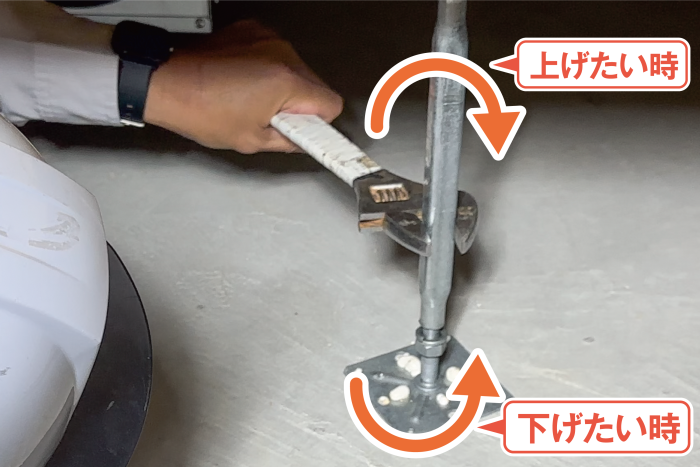床下にある「鋼製束(こうせいづか)」のナット部分をゆるめ、鋼製束が動くようにします。