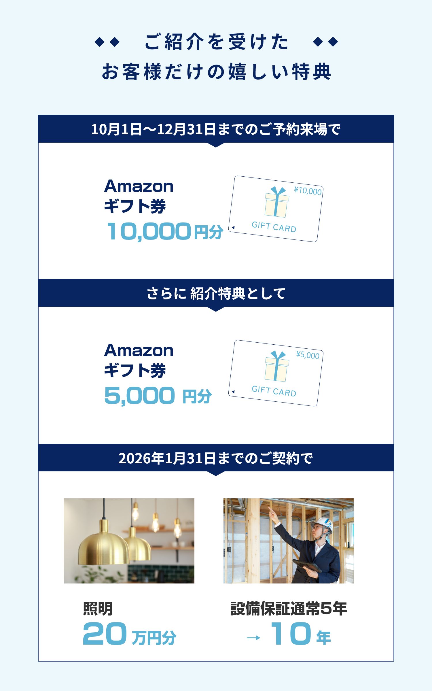 • ※ご来場イベントのエントリールールに則ってご来場頂けなかった場合や、ご相談の内容により建築のご予定がないと当社にて判断させて頂いた場合は、ご来場特典の送付を中止させていただく場合がございます。
