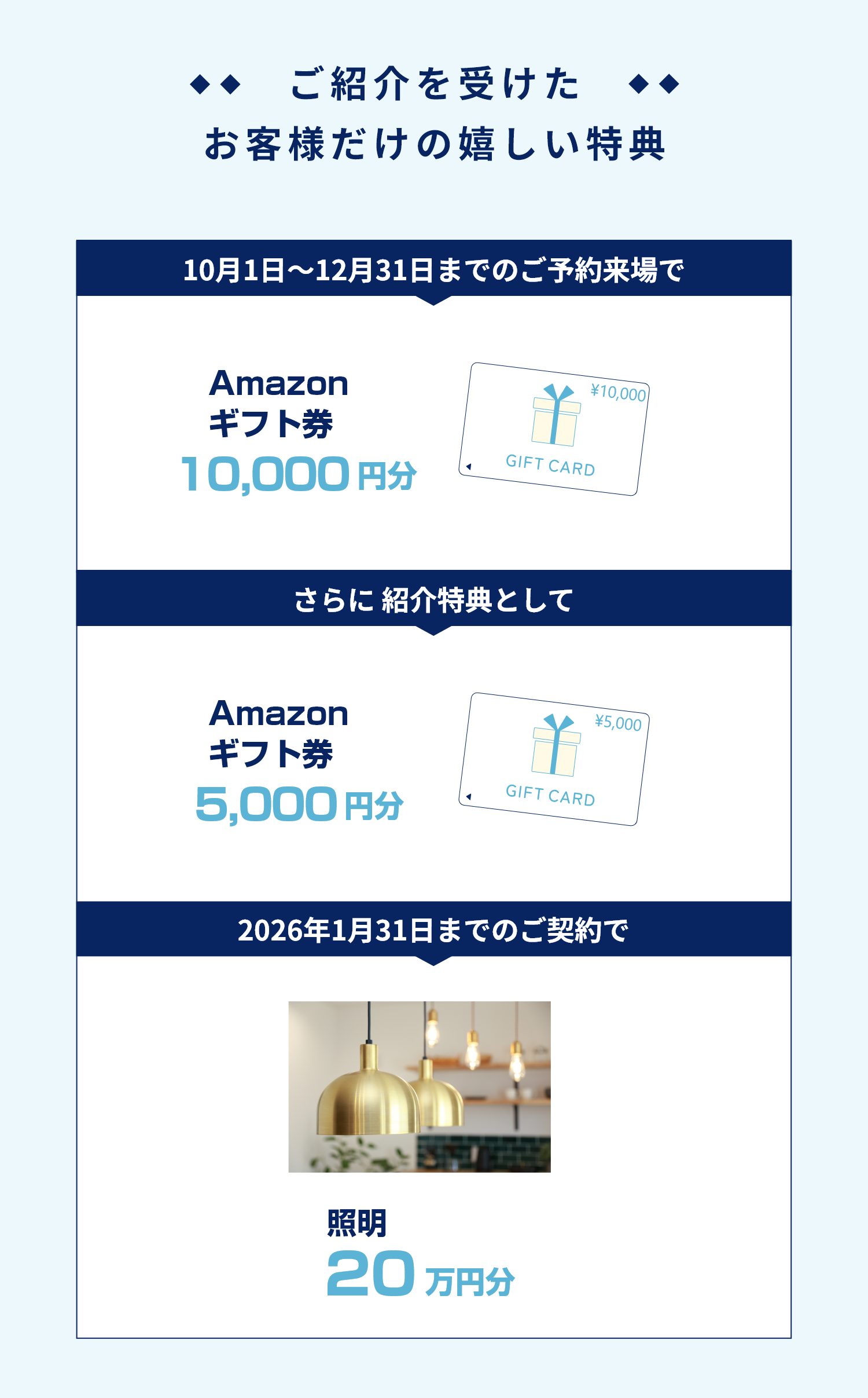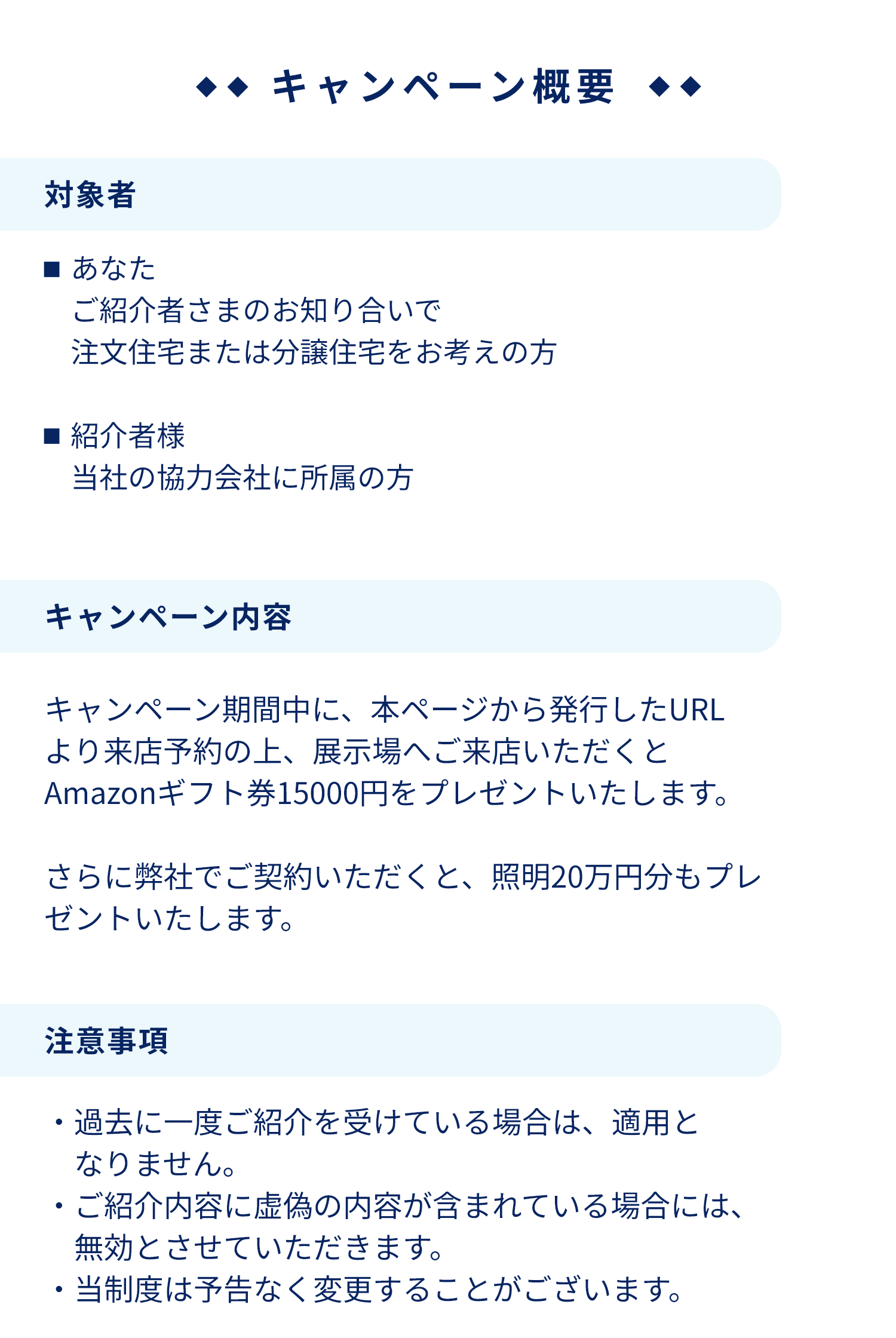 • ※ご来場イベントのエントリールールに則ってご来場頂けなかった場合や、ご相談の内容により建築のご予定がないと当社にて判断させて頂いた場合は、ご来場特典の送付を中止させていただく場合がございます。